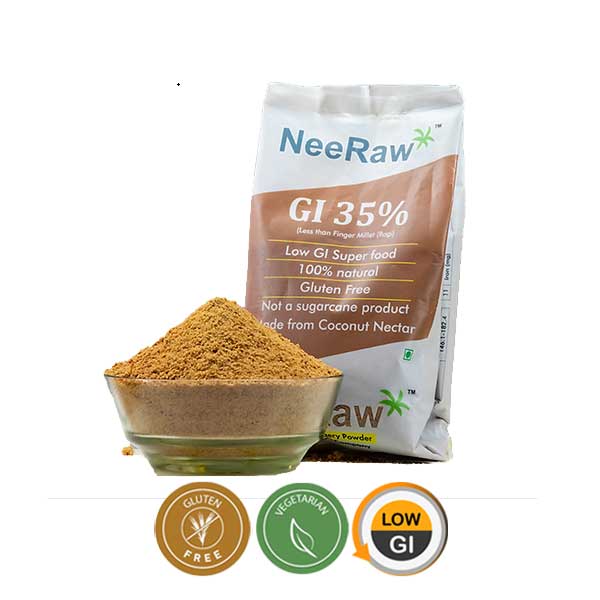 Neera Jaggery is made from coconut nector. This is very rich in nutrients and has GI of 35. NeeRaw Jaggery is sweet and delicious and can be used as a replacement for jaggery and sugar